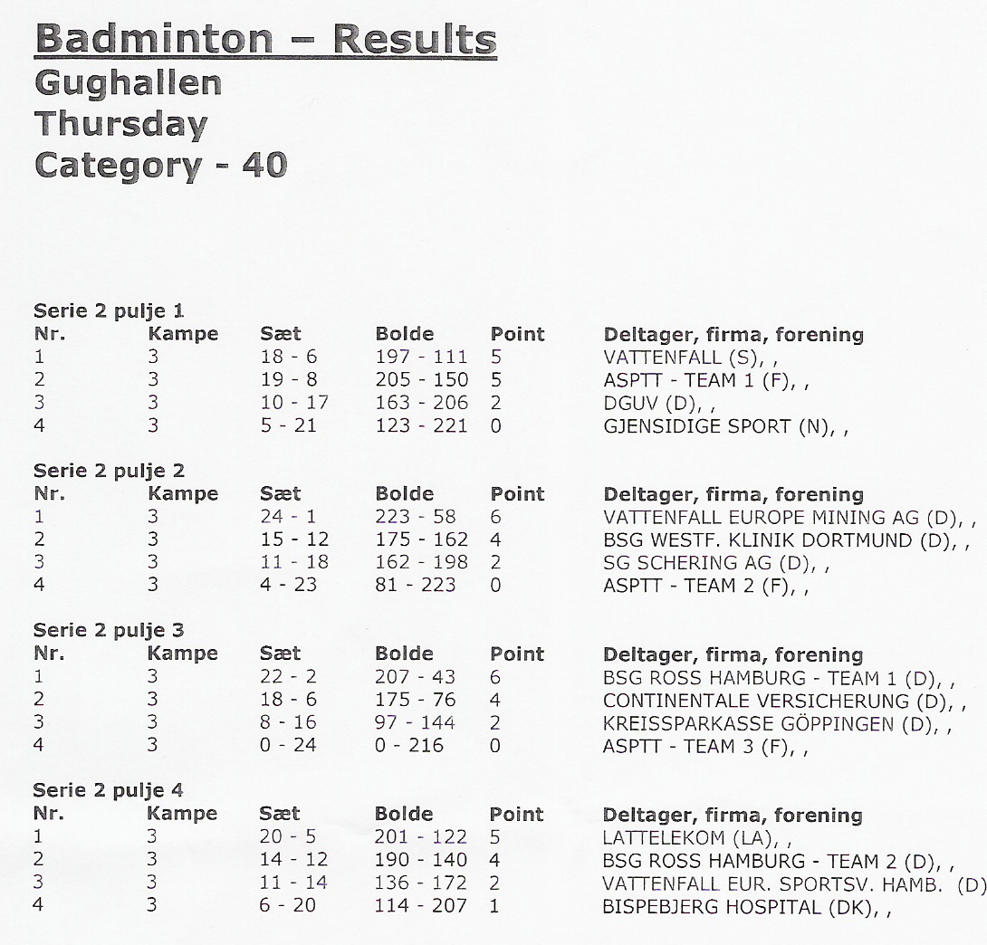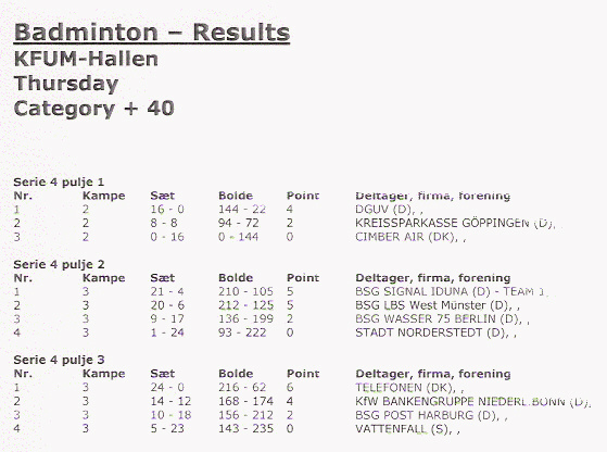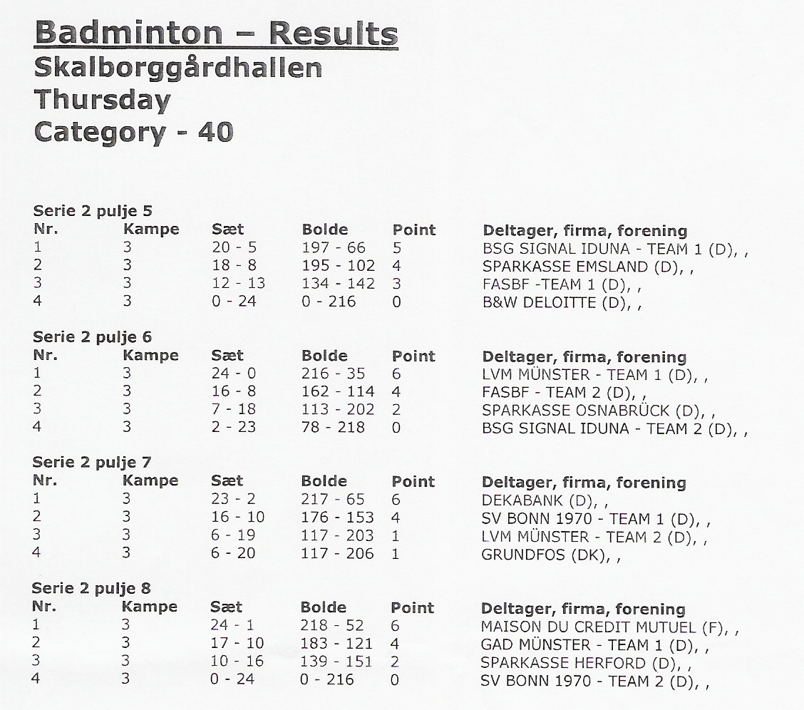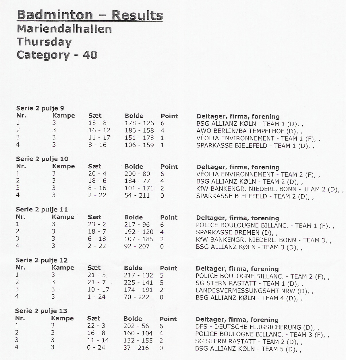 Zum Schluß noch ein kleines Kuriosum: der Gegner von KfW 2 am zweiten Spieltag, die DeKa-Bank, spielte in der ersten Runde des KO-Tages gegen Vattenfall 2-2 nach Spielen. Sie waren satz- und punktgleich. Daraufhin wurde ein Spiel gelost, welches den Sieg bringen sollte und für die DeKa äußerst unglücklich wurde die schwächste Paarung, das Mixed, gezogen.